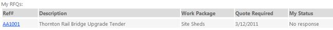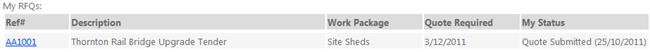 Requests for Quotation are shown under the My RFQ's page which can be accessed by clicking on the button in the navigation toolbar at the top of the screen. Shown in this list are any Requests for Quotation (RFQ) that you have been invited to tender for. These RFQ's are shown with their description, the relevant work package, the due date for submission and the current status of your submission. Example below: