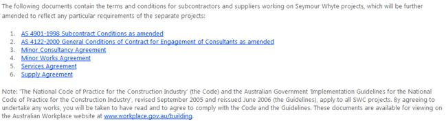 The Seymour Whyte Constructions standard Terms and Conditions can be easily accessed through this portal as well. This can be found by clicking on the Terms and Conditions button in the navigation toolbar at the top of the screen. Shown below: